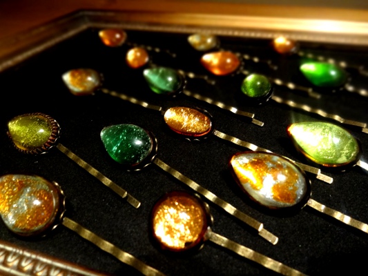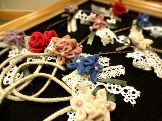 左は、人気のフェルトで作るお花の ヘアゴムとピンのセットです。 5種類のご用意です。 右は、フランスのアンティークビーズのヘアピンです。クラシックな色合いが素敵ですよ~!