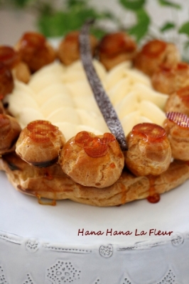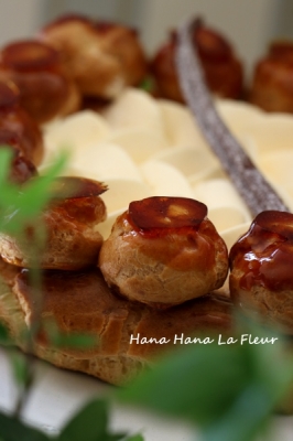 クリームが絞れたら、プティシューにカラメルをコーティングして、周りに貼り付けます