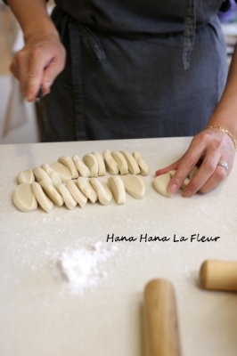 一生懸命に捏ねた生地を、棒状に伸ばしたら、同じ大きさに切るあるよ