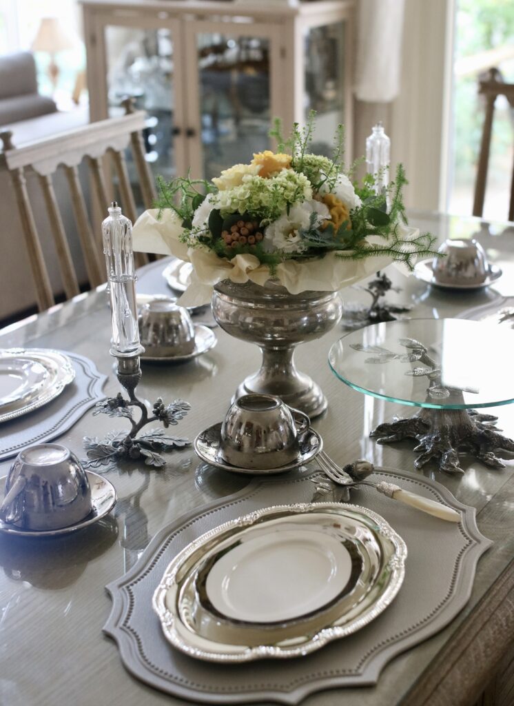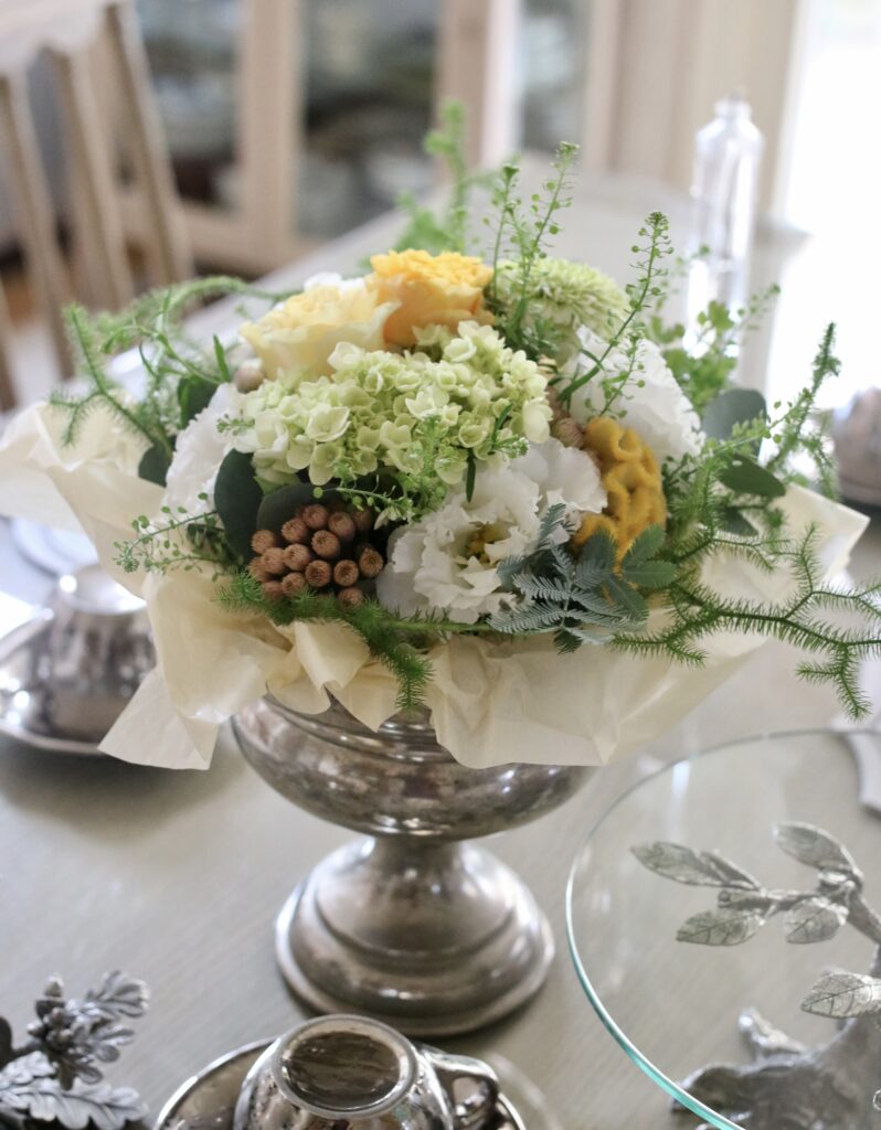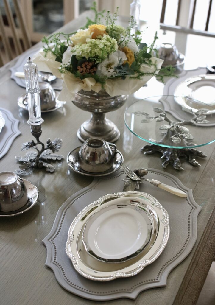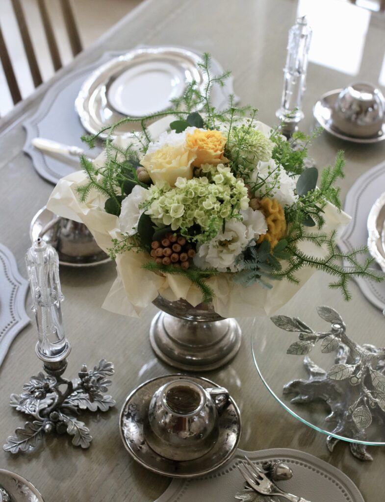 何色のお花にも合わせられるシルバーの食器は優れもの