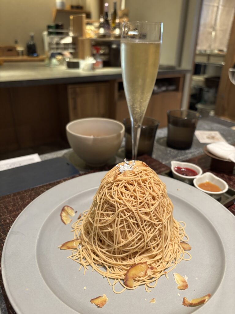 最中のような食感の軽いメレンゲとふわふわの糸のようなモンブランの美味しいこと ^^