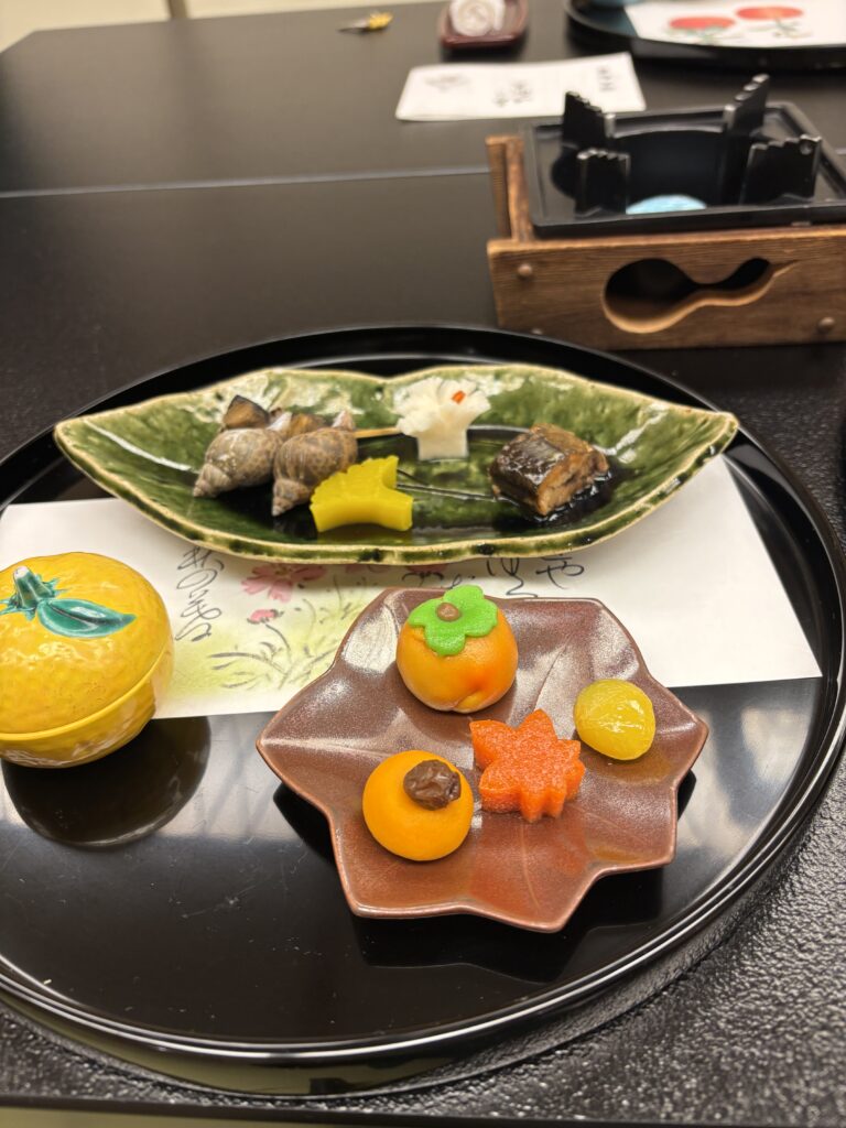 酒こう ( 秋刀魚・春菊しろ和え・黒バイ貝・柿麩)