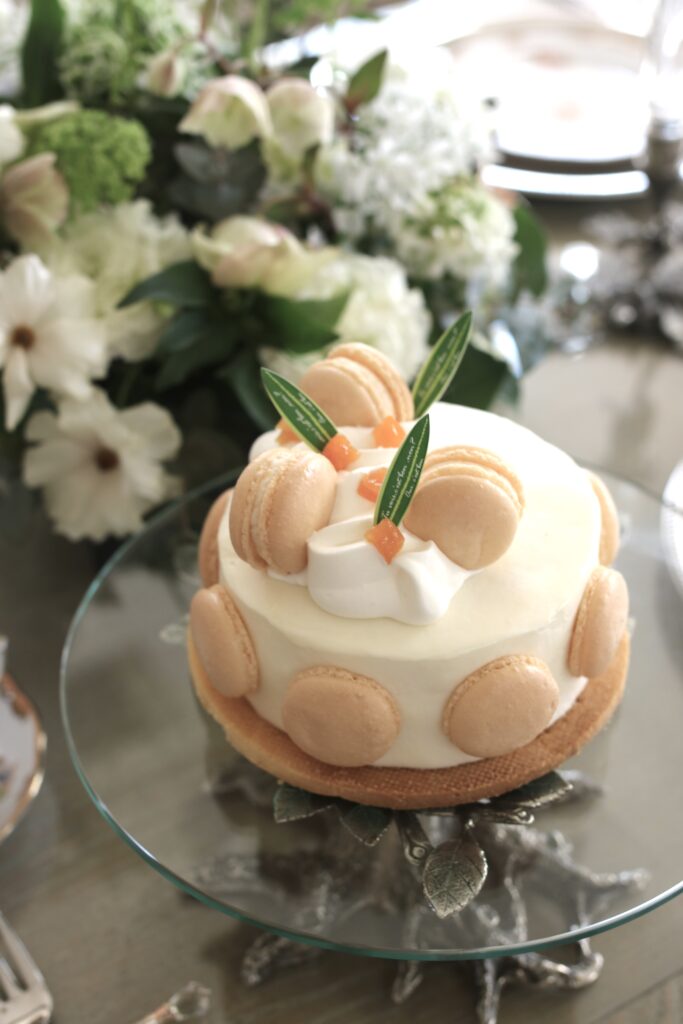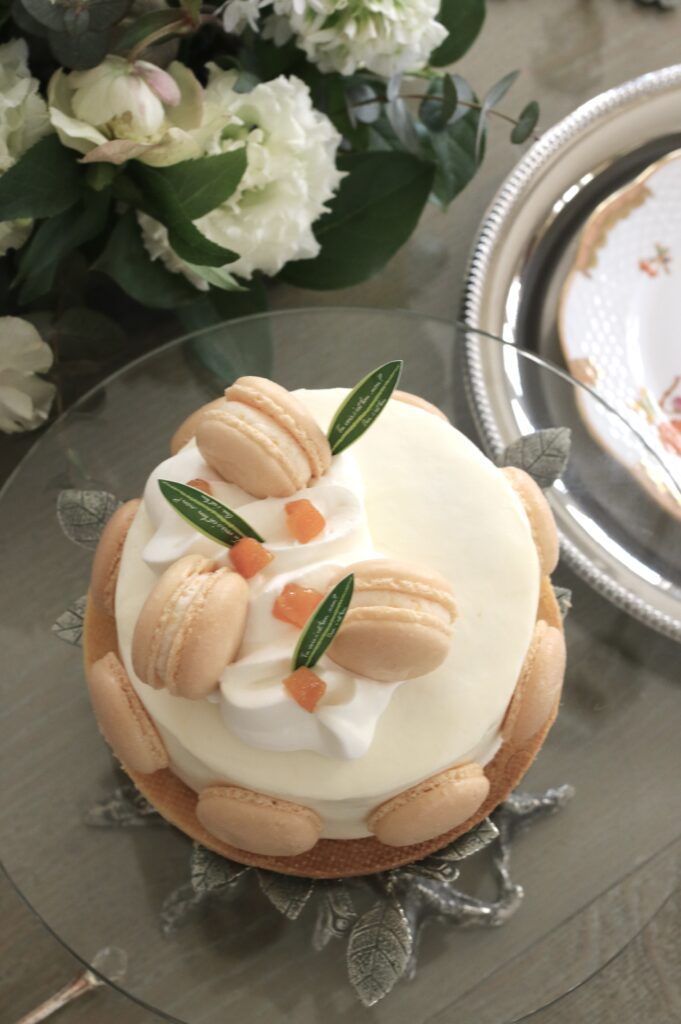 ガレットサブレの上に重ね、マカロン・アプリコットを添えて完成です