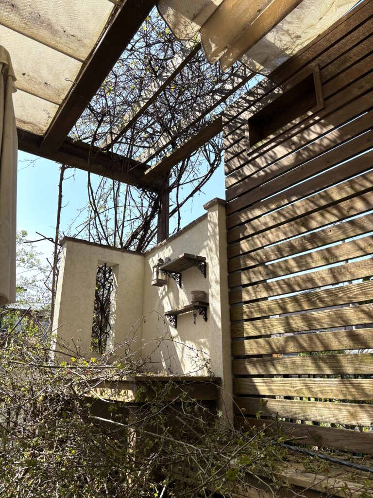 大きく育ったモッコウバラの枝が敷地外にピョンピョン伸びていき