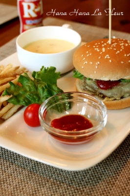 今朝の朝ごはんは、パパ特製 ハンバーガー
