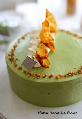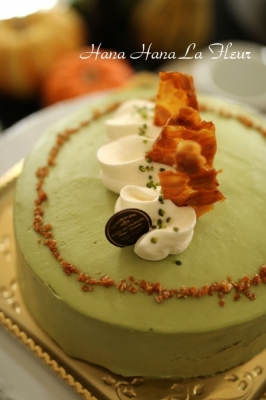 プラリネの香ばしさと、抹茶のほろ苦い甘さが とってもバランスの良いケーキです