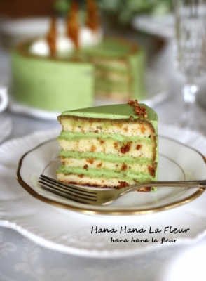 アーモンド プラリネを焼き込んだ ジェノワーズ に シャンティ・抹茶 を交互に4層 重ねたケーキ